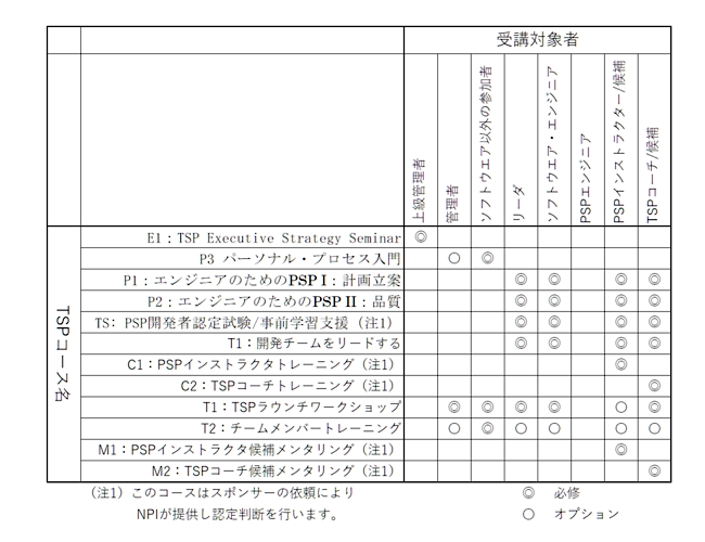 • PSP計画立案とPSP品質マネジメント受講を完了していること、TSPプロジェクト発進ワークショップを体験していることです。